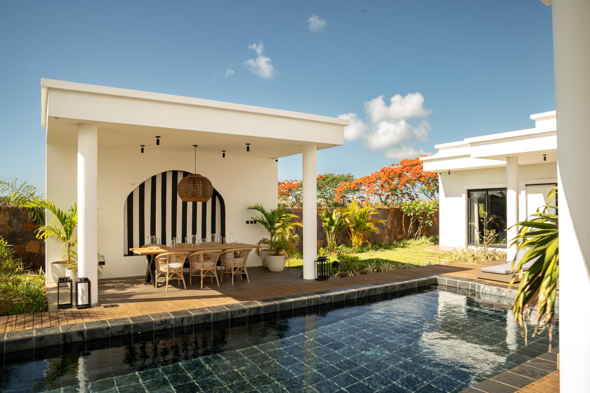 Sumptuous villa of 400 m² on a beautiful plot of 289 toises, furnished and equipped, offering an exceptional lifestyle combining luxury, comfort and privacy. Located in the heart of Balaclava, within the prestigious gated community of Royal Park, this property stands out for its elegant contemporary architecture, spacious layout and high-end finishes. Nestled in a green and peaceful environment, it enjoys a privileged setting just minutes from the beach. Offering easy access to Port Louis and Grand Bay, this property is ideally located close to the Riche Terre Mall, offering convenient access to shops, restaurants and essential services.